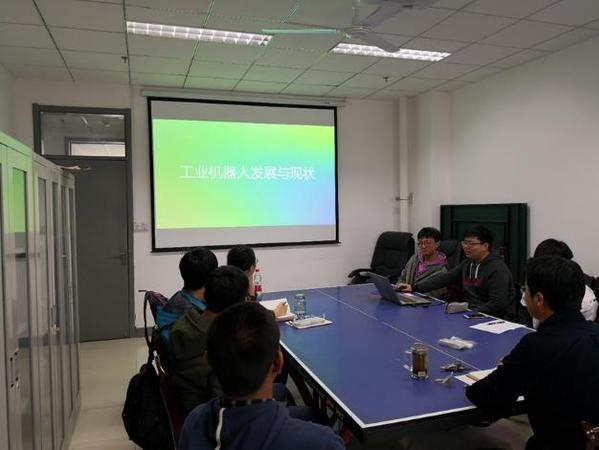 本次研讨按照殷晓康老师要求,同学们分小组事先做了准备,在会上分享讨论。迟克浩小组从工业机器人的定义、工业机器人的主要应用领域与工业机器人的组成等方面进行了细致讲解。刘旭保小组展示了码垛机器人的具体结构并对比分析了各国工业机器人的发展历程,殷晓康老师对码垛机器人的结构与控制系统做了补充说明,同学们受益匪浅。顾倍康小组从社会学的角度阐释了我国工业机器人发展的制约因素等。最后,殷晓康老师对工业机器人的探讨进行了总结,肯定了同学们的努力。随后,殷老师还与同学们讨论了读研的相关问题,提醒同学们要早做准备。