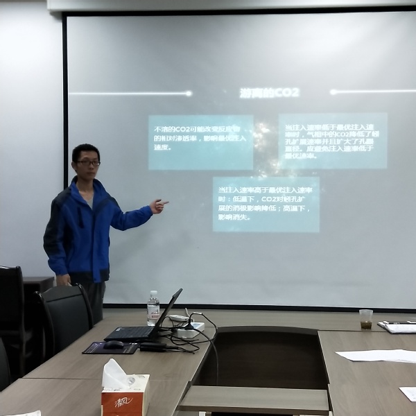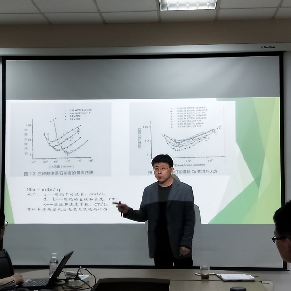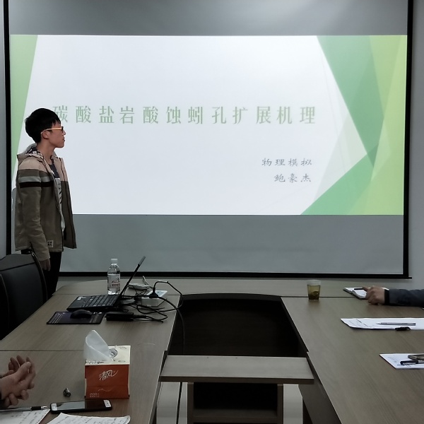 研讨会上,同学们就个人调研情况进行了PPT汇报。孟令童就“蚓孔”的形成过程进行了了生动形象的描述:“以砖头蚓孔形成为例,由于砖头表面有很多形状、尺寸各不相同的裂缝,将酸性溶液倒在砖头表面时,裂缝大的地方酸性溶液进入的比较多,腐蚀砖头基体使得孔隙变得更大,进而导致溶液进入的更多。循环往复,大裂缝较小裂缝生长速度更快,从而形成了酸蚀蚓孔”。在师生讨论环节,针对同学们提出的问题,“模拟酸蚀蚓孔的意义”,齐宁老师给出这样的解释:“模拟结果在酸性溶液用量、施工设计等方面都具有现实的指导意义,是科研学习中重要的一种手段”。