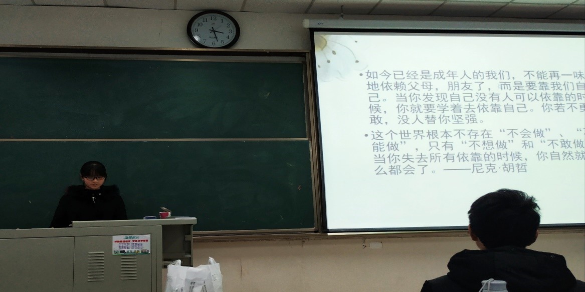 老员工活与高中有着很大的不同,无论是学习还是生活,大学里最关键的是要靠自己的努力。小组成员分别上台展示了自己进入大学半年以来的收获、适应老员工活的方法。同学们从生活、学习、人际交往以及社团活动等多个方面,对如何适应老员工活提出了自己的看法。自律和有计划性,是大家提到最多的两个词。大家一致认为生活上,要自立自强,提高自理能力;学习上,自我督促自我激励,制定明确的学习目标;人际交往上,多结交志同道合的朋友,扩宽自己的交往空间。王荣明老师对同学们在学习与研讨方面提出了自己的建议,提醒大家尽快适应老员工活,在学习上不能过度较真,更不能钻牛角尖。他亲切询问了大家对未来的规划,以及之后可能会选择的专业,以便之后更好地指导我们。