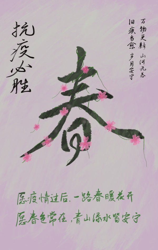 第六期人文素养班唐子仪手绘海报《抗疫之春》。 “这是一幅以“春天”、“抗疫”为主题的海报,海报采用粉色和绿色的搭配,充满生机与活力。最中间的一个春字上缠绕着樱花,象征着春意盎然,旁边的字凸显主题,底层的字代表了美好的祝愿。”冰会销,雪会化,花朵会生长在枝桠,一切都会显得如诗如画。