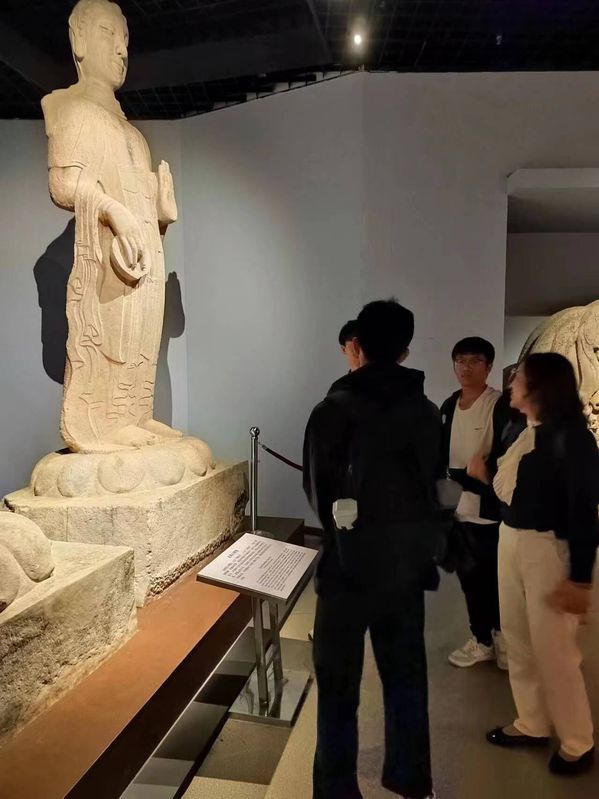 进入博物馆一楼展厅,映入眼帘的便是镇馆之宝——北魏石佛像,同学们驻足细心端详。随后,栾著老师依次为大家介绍了展现灿烂文明的青岛史韵馆,讲述红色故事的革命纪念馆,体现特色青岛文化的民俗馆,并讲述了青岛博物馆的历史沿革及其馆藏珍品,同学们听后受益匪浅。步入三楼,大家在博物馆讲解员的介绍下,进一步了解了与青岛港口有关的瓷器的历史、制作工艺,及口口相传的文物故事。